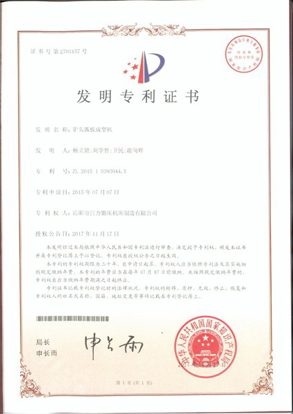 驢頭弧板成型機(jī)實(shí)用新型專(zhuān)利證書(shū)