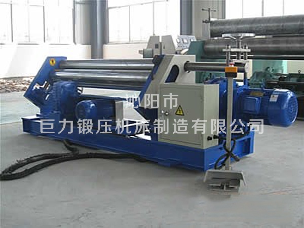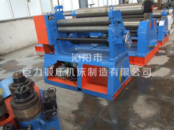 三輥非對(duì)稱式卷板機(jī)結(jié)構(gòu)形式為三輥非對(duì)稱式,上輥為主傳動(dòng)輥,在兩下輥中央對(duì)稱位置作垂直升降運(yùn)動(dòng),通過液壓缸內(nèi)的液壓油作用子活塞而獲得,為液壓傳動(dòng);兩下輥體旋轉(zhuǎn)運(yùn)動(dòng),通過減速機(jī)的輸出齒輪與下輥齒輪齒合,為卷制板材提供扭力,同時(shí)作為主傳動(dòng);邊輥?zhàn)鲀A斜升降運(yùn)動(dòng),具有預(yù)彎和卷圓雙重功能,結(jié)構(gòu)緊湊,操作維修方便。